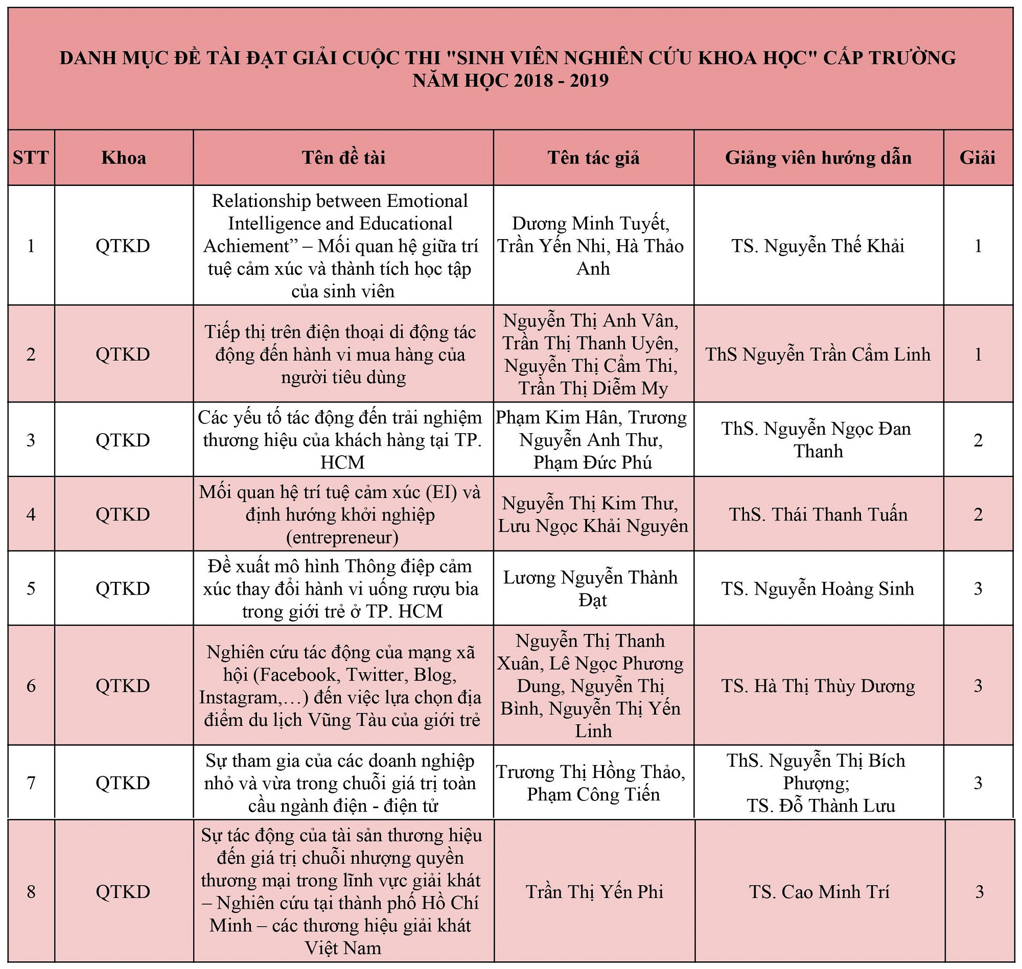 Năm 2022-2023 sinh viên Khoa Quản trị Kinh doanh có 20 đề tài đạt giải nghiên cứu khoa học cấp trường