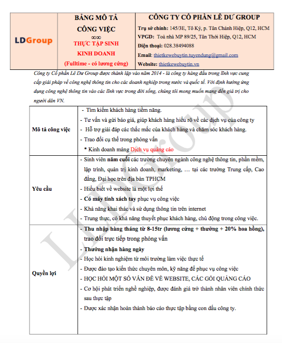 THÔNG BÁO TUYỂN THỰC TẬP SINH ĐÀO TẠO VÀ PHÁT TRIỂN NGUỒN NHÂN LỰC