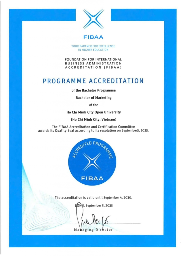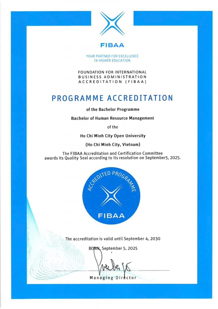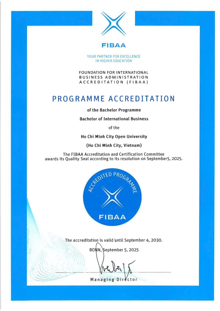 Vào ngày 05/9/2025, tổ chức đảm bảo chất lượng giáo dục uy tín của Châu Âu – FIBAA đã công nhận và trao chứng nhận đạt chuẩn kiểm định cho 03 chương trình đào tạo chính quy Trường Đại học Mở TP.HCM bao gồm: (1) Cử nhân Kinh doanh quốc tế, (2) Cử nhân Marketing và (3) Cử nhân Quản trị nhân lực.